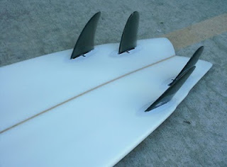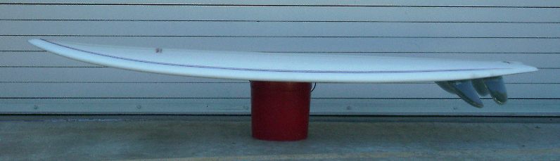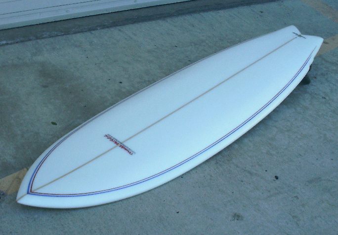 This was a shape I did a couple of years ago and was one of my favorites.. A 6-4 modern fish with quad fin setup. What was unique about this shape was the use of a slope deck to extend volume out to the rails while still maintaining a nice thin rail. Dimensions are: 6'4" 15” x 20.5” x 15” 2.75”. Board featured LokBox quad fins. As shown in the pix, I first ran the Turbo Speed Dialer fins but didn't like the feel...too "drifty" on hard bottom turns. As a 185lb surfer, I need a little more fin. In a quad setup I like the Taylor Knox fin template in front. It has a 4.68" depth for extra hold and drive. Then I like to use either the smaller LBXM3.8 80/20 foiled rears or just LB side-bite for the rears. It has a 4oz+4oz deck & 6 oz bottom with clear, sanded-gloss finish to add durability while keeping overall weight low. The double-wishbone pinlines (red&blue) give the board a classic look. Glass work was done by West Coast Glass in Encinitas. The board surfed fast but smooth.