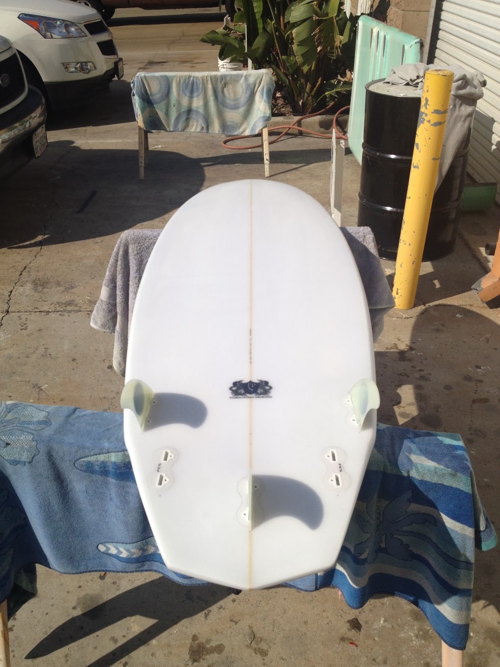 Board will glassed with two layers of S-cloth on deck to help combat those dreaded heel-dents. Fin setup will be quad Futures with FCS plugs in center fin position. Justin will have multiple fin config options!